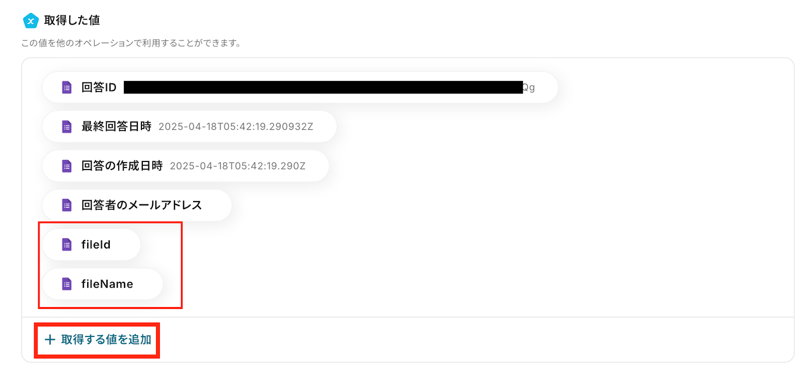 ・Googleフォームをトリガーとして使用した際の回答内容を取得する方法は下記を参照ください。