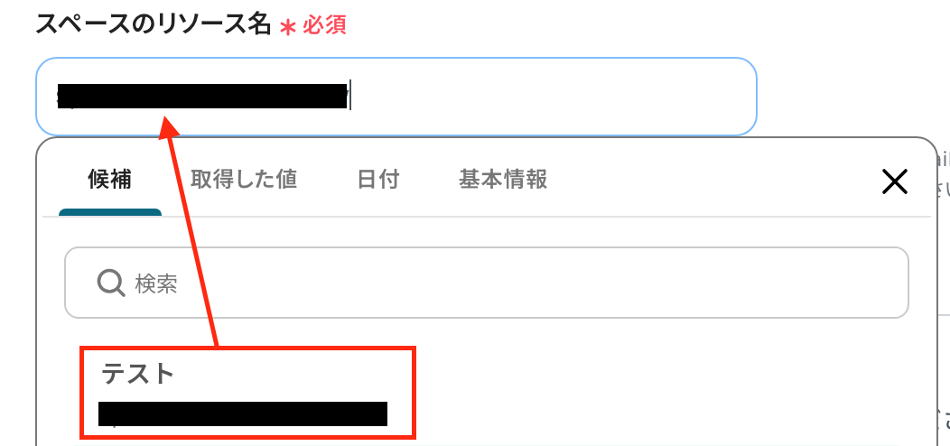 続いて、API接続設定画面に遷移したら、「スペースのリソース名」を設定してください。入力欄をクリックして表示される候補から選択できます。