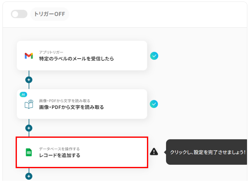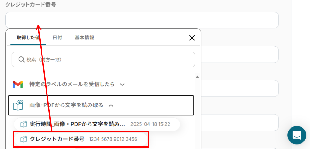 ここでは、先ほど抽出したクレジットカードの文字データをGoogle スプレッドシートのレコードに追加する設定を行います。