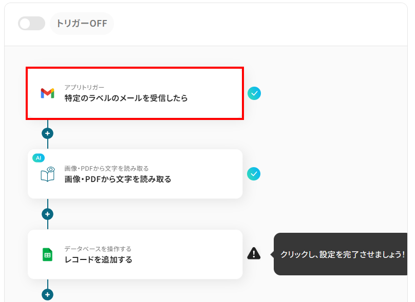 ここでは、代表的な例として「Gmailで送付されたクレジットカード画像をOCRで読み取り、その情報をGoogle スプレッドシートに追加する」自動化フローの作成手順を解説します。Yoomでは、プログラミングの知識がなくても、画面上の設定だけで簡単にこのような連携を実現できます。