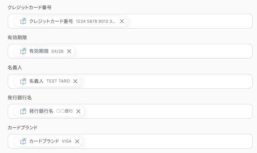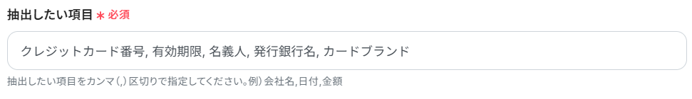- 抽出したい項目:添付ファイルからどの項目を抽出したいか入力します。今回は、メールに添付したファイルから「クレジットカード番号, 有効期限, 名義人, 発行銀行名, カードブランド」を抽出したいため下記のように入力しました。お好みに合わせて、カンマ(,)区切りで入力しましょう。