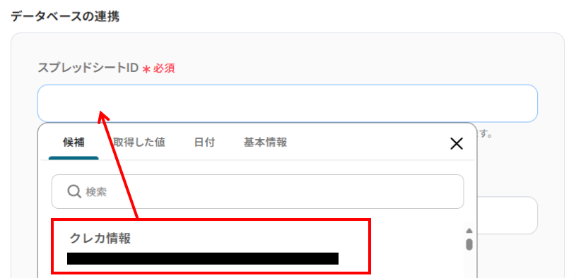 - スプレッドシートのタブ名:先ほど入力したスプレッドシートIDと同様に、入力欄をクリックし対象のシート名を候補より選択してください。