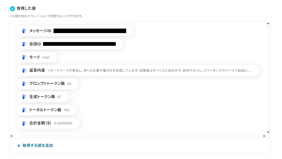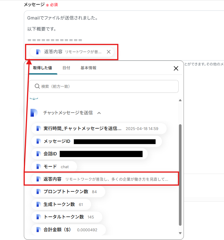 「メッセージ」は、入力欄をクリックして表示されるアウトプット(取得した値)から選択できます。 ※今回は、以下画像のように設定しました。