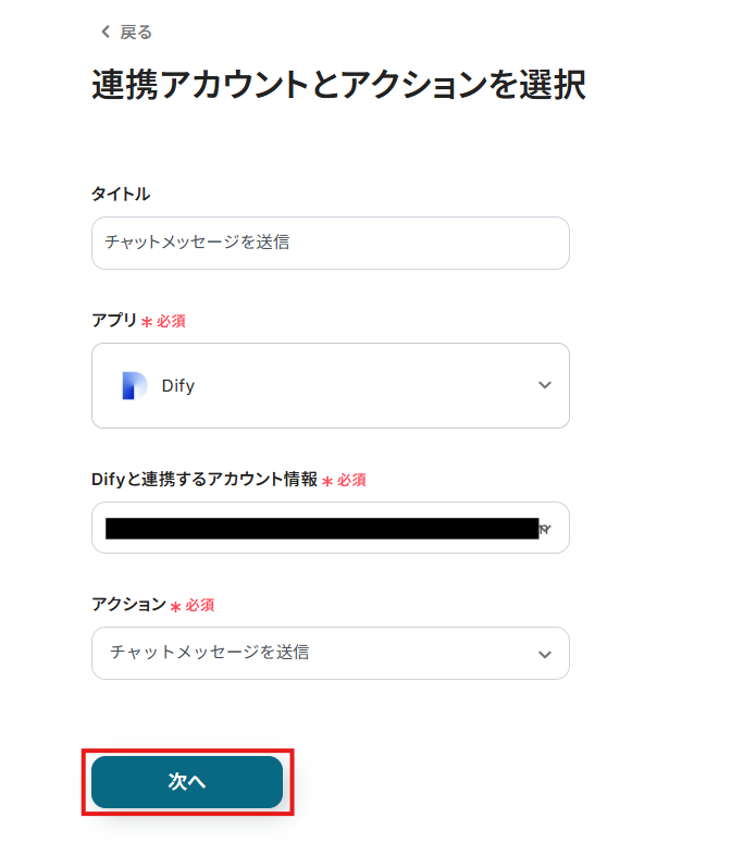 2.表示された画面で各項目を確認します。 アカウント情報を任意で設定し、トリガーアクションはそのままにして、「次へ」をクリックしましょう。