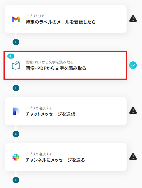※以下の画面は、Yoomページ画面左側「マイプロジェクト」のフローボットで表示される、「【コピー】Gmailでファイルが送信されたらOCRで読み取り、Difyで要約しSlackに通知する」をクリックすると表示されます。