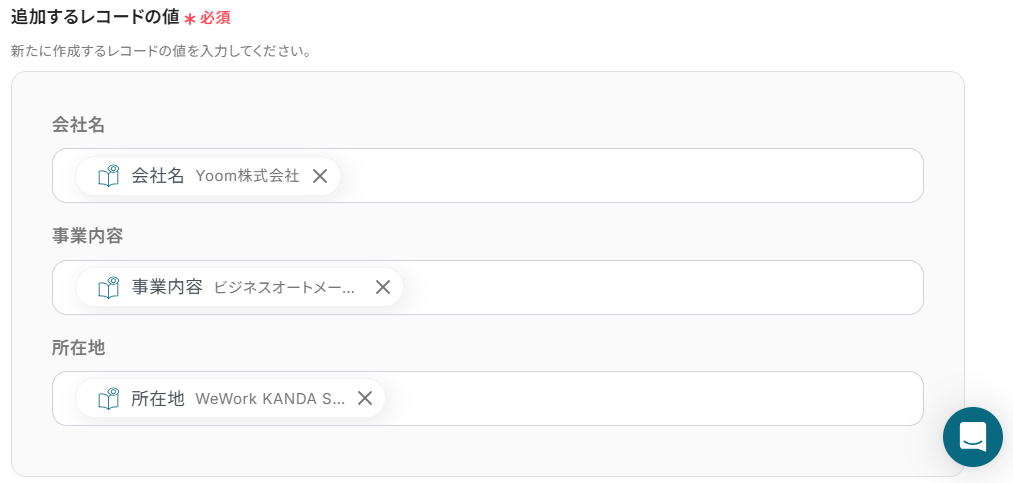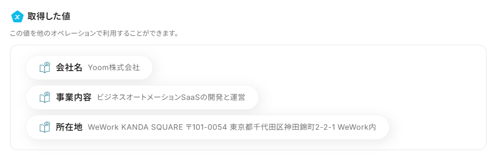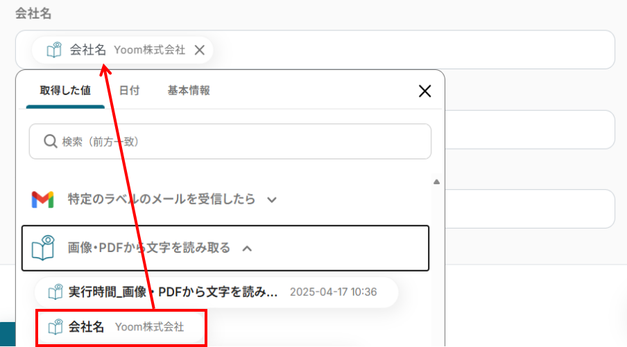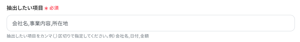 抽出したい項目:添付ファイルからどの項目を抽出したいか入力します。今回は、スクリーンショットから「会社名,事業内容,所在地」を抽出したいため下記のように入力しました。お好みに合わせて、カンマ(,)区切りで入力しましょう。