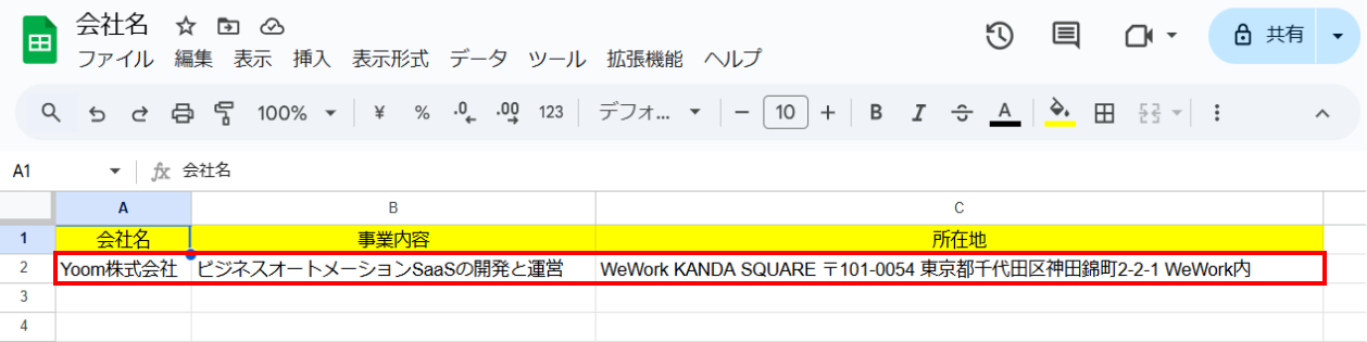 入力が完了したら、「テスト」を実行してください。 テストが成功すると、Google スプレッドシートの指定したファイルにデータが追加されているはずなので確認してみましょう! 下記赤枠のように、OCRの結果が反映していればOKです。 最後に、Yoom画面に戻り「保存する」を押して次のステップにお進みください。
