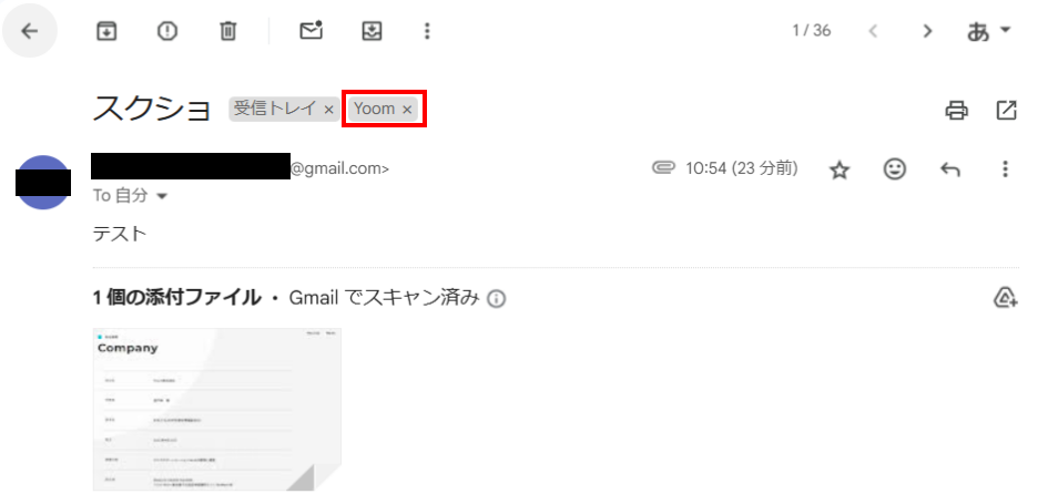 また、この後のテスト操作でタグが付いたメールを送信する必要があります。 今回は、下記のような会社概要のスクリーンショットを添付し、タグを付けたメールを送信しました。