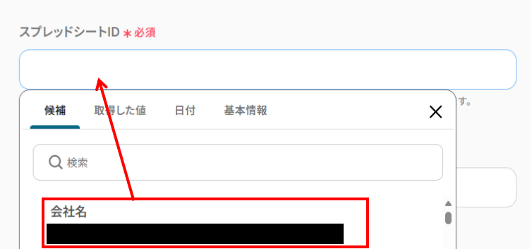 スプレッドシートのタブ名:先ほど入力したスプレッドシートIDと同様に、入力欄をクリックし対象のシート名を候補より選択してください。