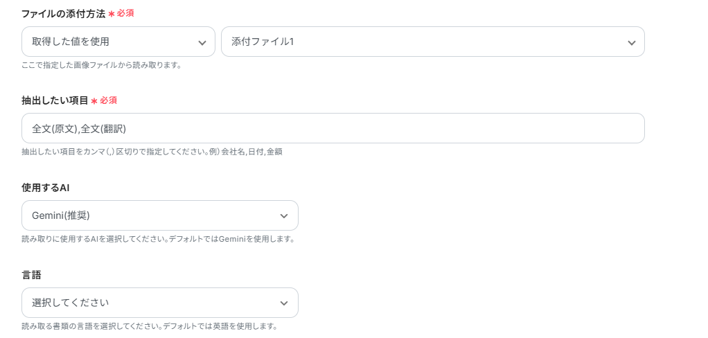 AI読み取りの詳細設定ですが、今回は下記のように設定しました。
