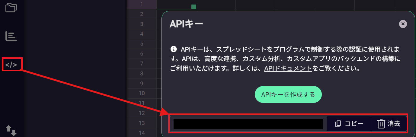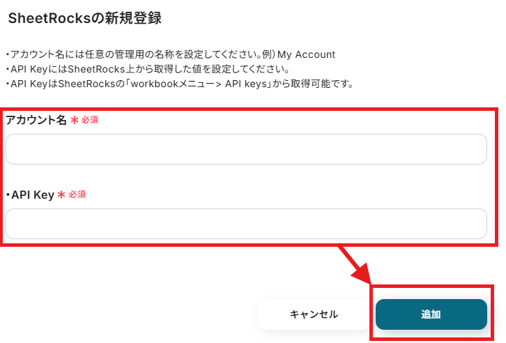 アカウント名は任意で入れ、API KeyはSheetRocks上より取得してください。