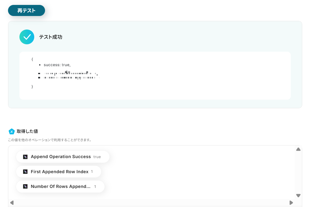 ここまで終わったらテストボタンを押します。テストが成功し、取得した値が入ればOKです。