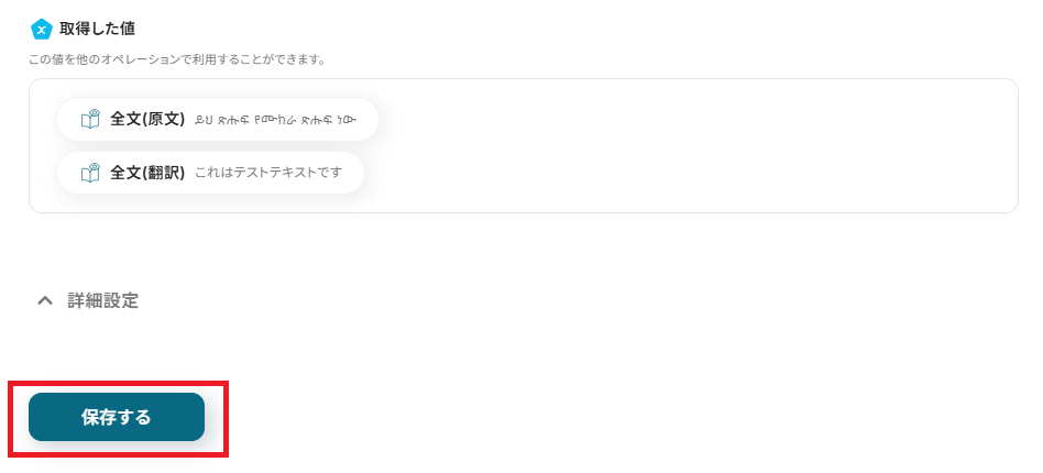ここまで設定ができたら、テストボタンを押します。テストが成功し、取得した値に全文(原文)と全文(翻訳)が入っているか確認してください。