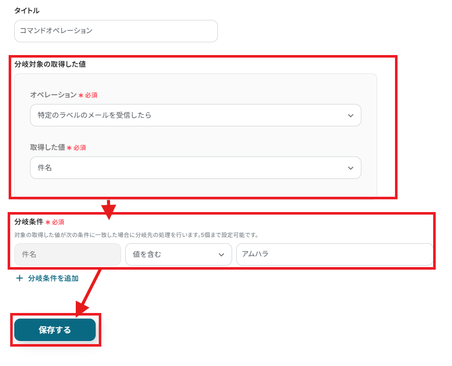 「タイトル」「分岐対象の取得した値」はそのままで、「分岐条件」が、件名・値を含む・アムハラになっているか確認してください。問題なければ保存するをクリックします。