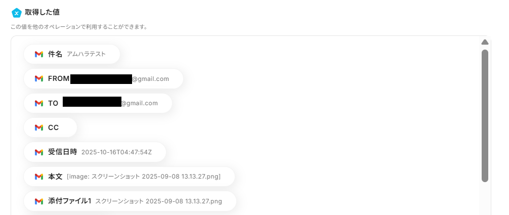 取得した値とは、トリガーやオペレーション設定時に、「テスト」を実行して取得した値のことを指します。