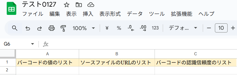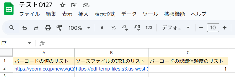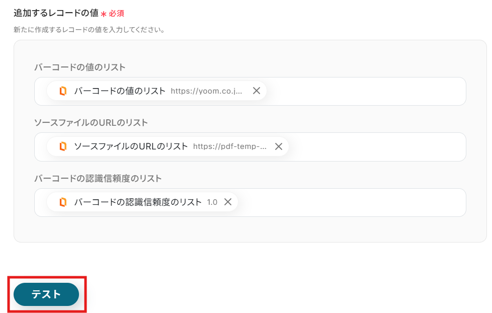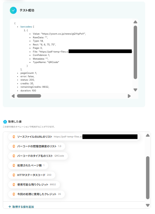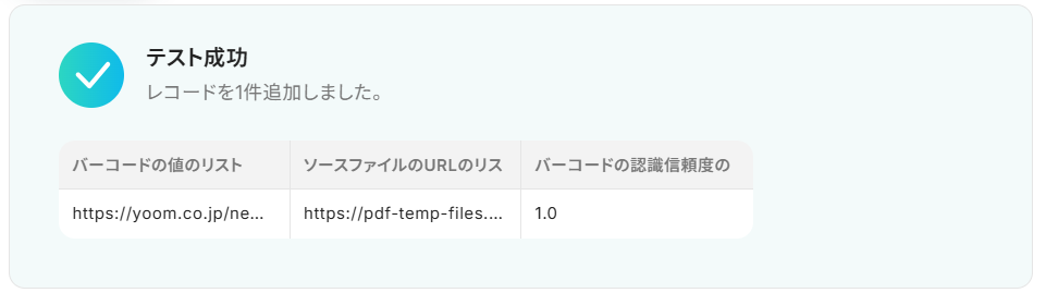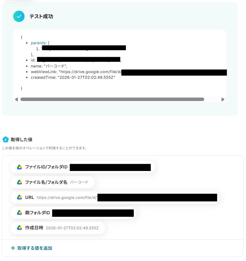 テストが成功すると、取得した値の各項目の横に、Google Driveにアップロードしたバーコードの詳細情報が表示されます。
