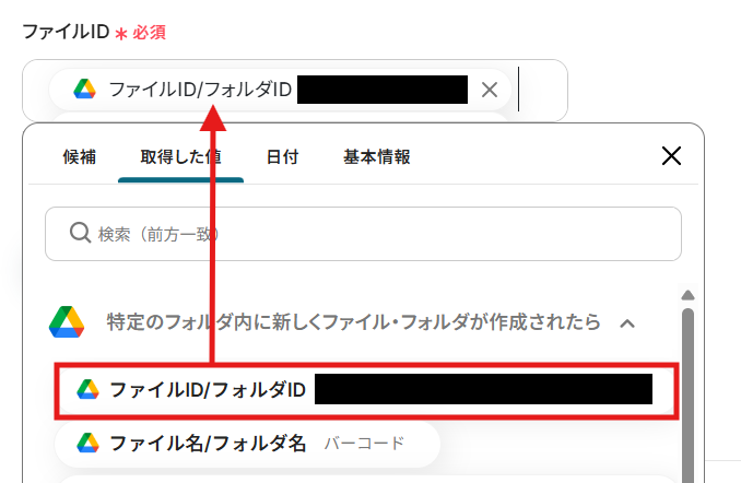 - Google Driveの「ファイルをダウンロードする」アクションでは、Googleフォームの回答から取得したファイルIDを任意で指定してください。
