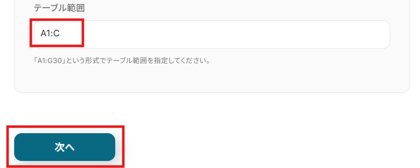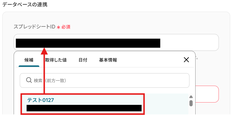 - Google スプレッドシートにレコードを追加する設定では、読み取った情報を記録したい任意のスプレッドシートIDと、シート内のタブ名を指定してください