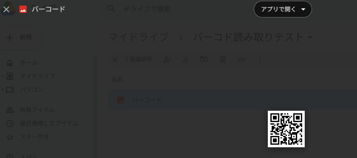 まず準備として、Google Driveの連携したいフォルダ内にテスト用のバーコードをアップロードしてください。