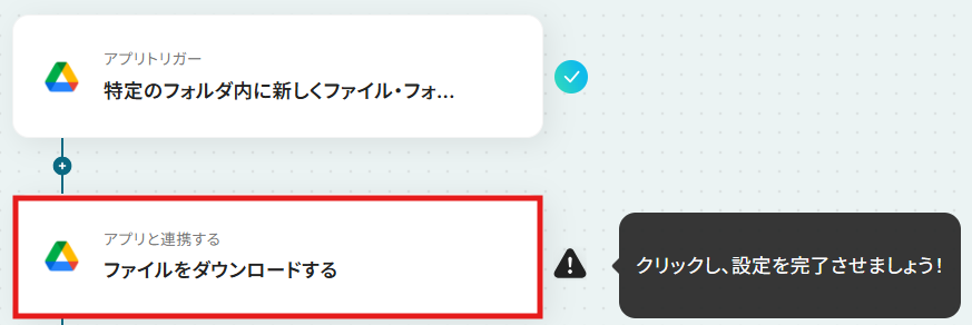- 続いて、オペレーションでGoogle Driveの「ファイルをダウンロードする」アクションを設定し、トリガーで検知したファイルを取得します