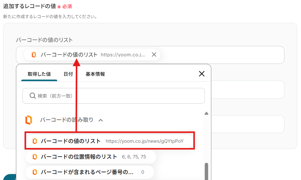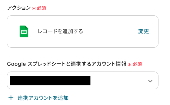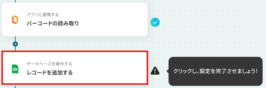 - 最後に、Google スプレッドシートの「レコードを追加する」アクションを設定し、読み取ったバーコード情報を指定のシートに追加します