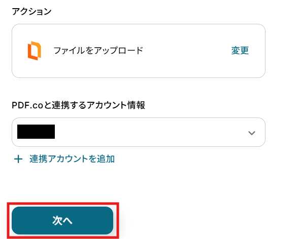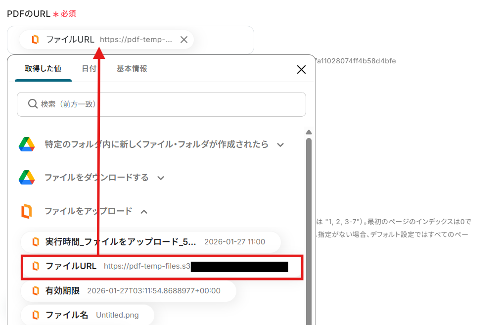 - 次に、PDF.coの「ファイルをアップロード」アクションを設定し、ダウンロードしたファイルをPDF.coにアップロードします