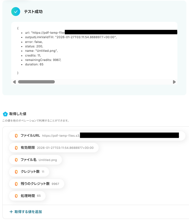 - 最後に、PDF.coの「PDFファイルにテキストを追加」アクションで、抽出したテキストを元のPDFファイルに追加します。