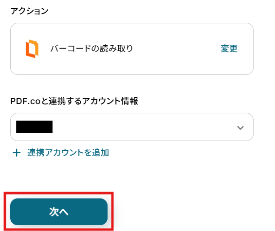 - さらに、PDF.coの「バーコードの読み取り」アクションで、アップロードしたファイルからバーコード情報を読み取ります
