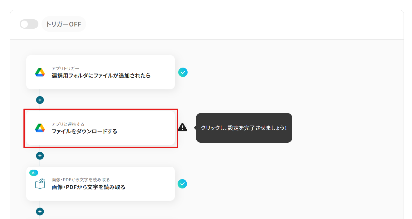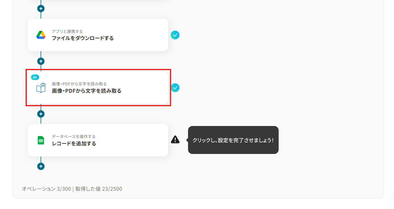 ダウンロードしたファイルからテキストを抽出しましょう。 ※ OCRや音声の文字起こしといったAIオペレーションは、チームプラン・サクセスプラン限定の機能です。 フリープラン・ミニプランでセットするとエラーになってしまうので、ご注意ください。 チームプラン・サクセスプランなどの有料プランは、2週間の無料トライアルが可能です。 トライアル期間中は制限のあるアプリやAIオペレーションも全て使えるので、気になる機能をぜひお試しください。