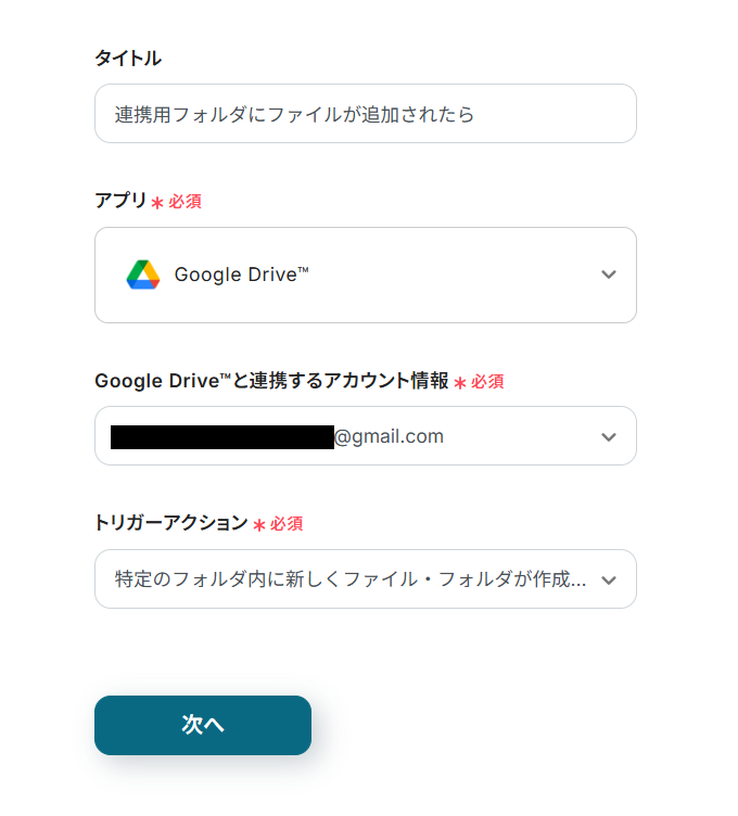 連携アカウントとアクションの内容を確認し、「次へ」をクリック。 ※ 「タイトル」は任意の名称に変更可能です。アクションの内容が分かりやすいタイトルにするとよいでしょう。 ここでは例として、「連携用フォルダにファイルが追加されたら」に変更しています。
