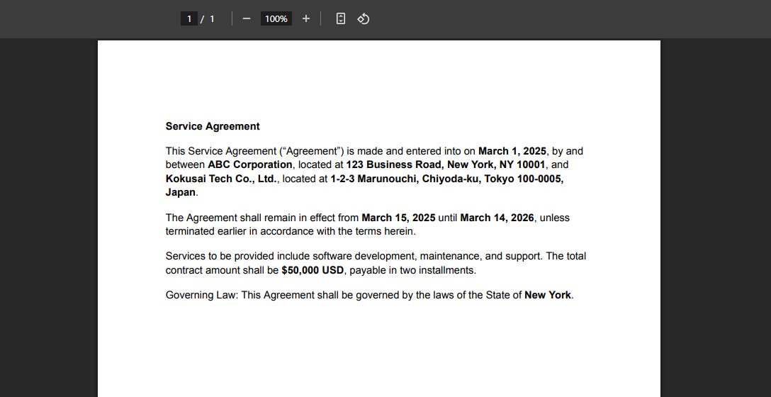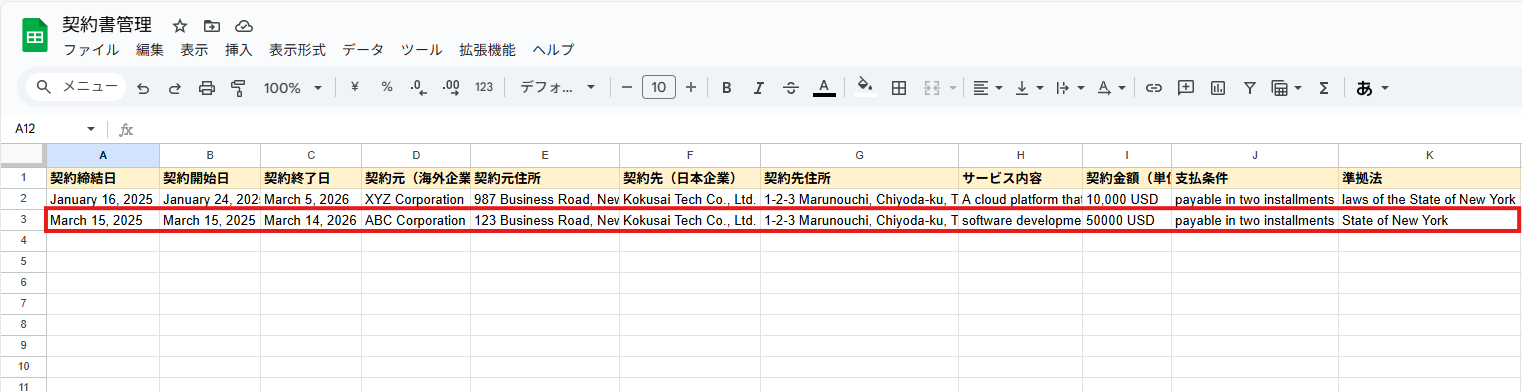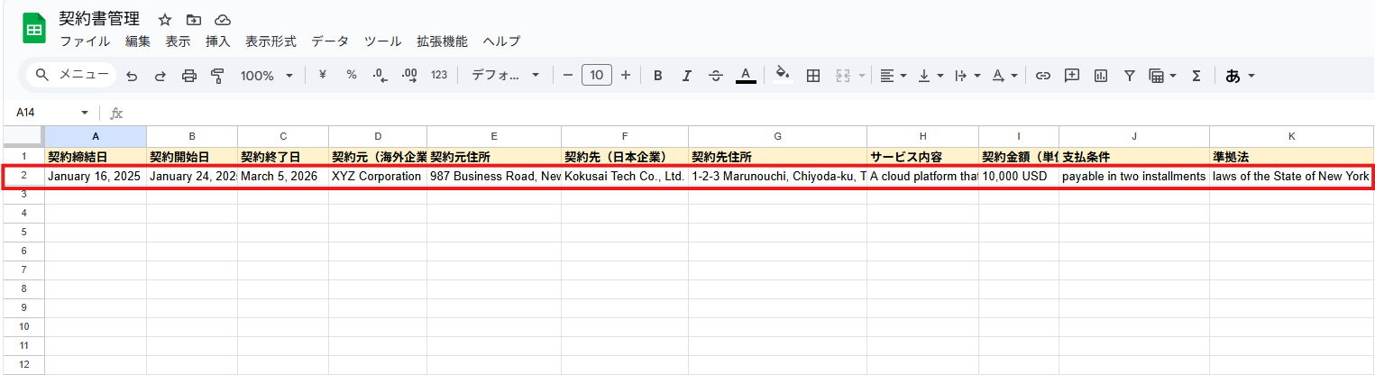 テスト用に、英文が記載されたPDFファイル(もしくは画像ファイル)と、抽出したテキストを追加するGoogle スプレッドシートのファイルをご用意ください。 ここでは例として、下図の契約書と契約書管理シートを使用します。