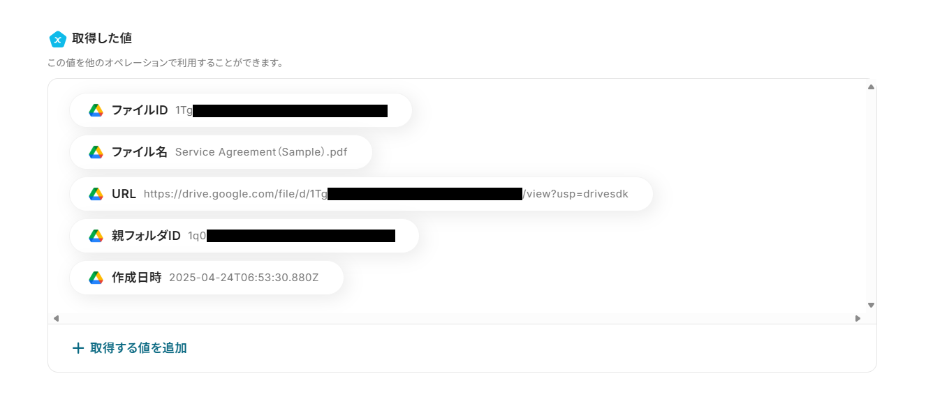 テストに成功すると、「取得した値」の各項目に最終更新日時が最も新しいファイル1件の情報が追加されます。