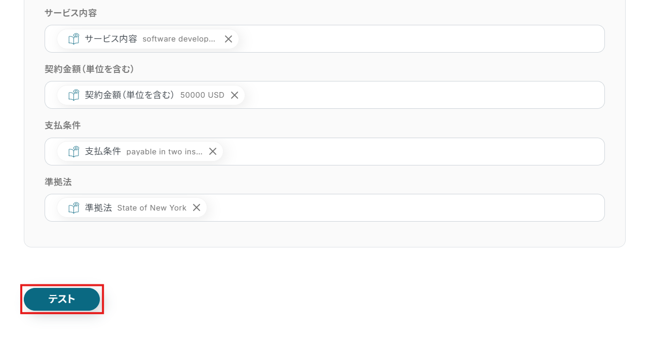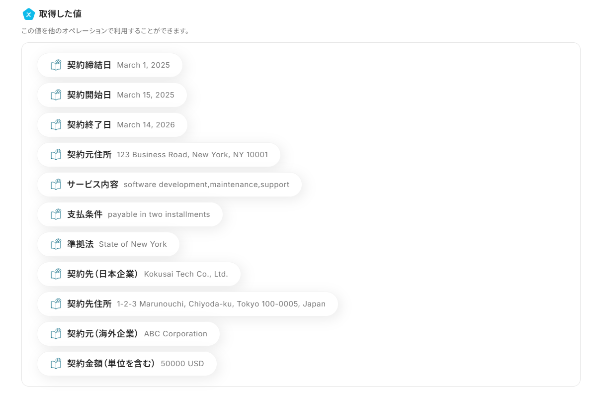 テストに成功すると、「抽出したい項目」に設定した項目の値がファイルから抽出され、「取得した値」に追加されます。 ※ 期待する値が抽出されていない場合には、「使用するAI」を変更して再度お試しください。