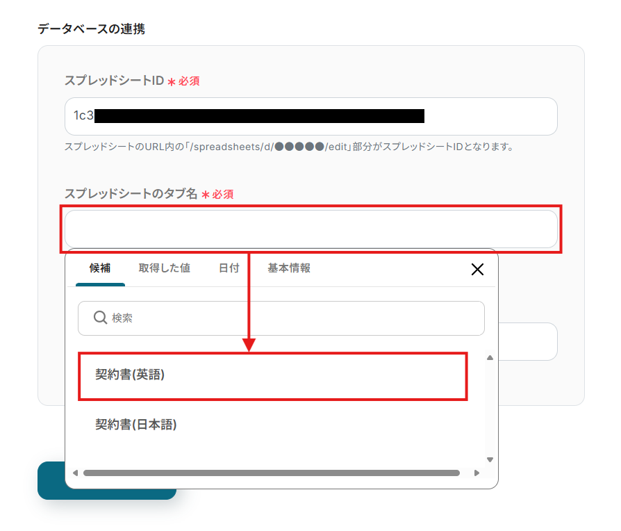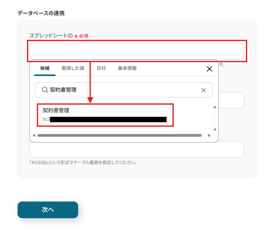 データベースの連携の「スプレッドシートID」に、抽出したテキストを追加したいスプレッドシートのIDを設定。 入力欄をクリックすると、連携しているGoogleアカウントからスプレッドシートの候補が表示されます。 前準備で用意したスプレッドシートを選択してください。 検索欄にスプレッドシート名を入れると検索が楽になります。