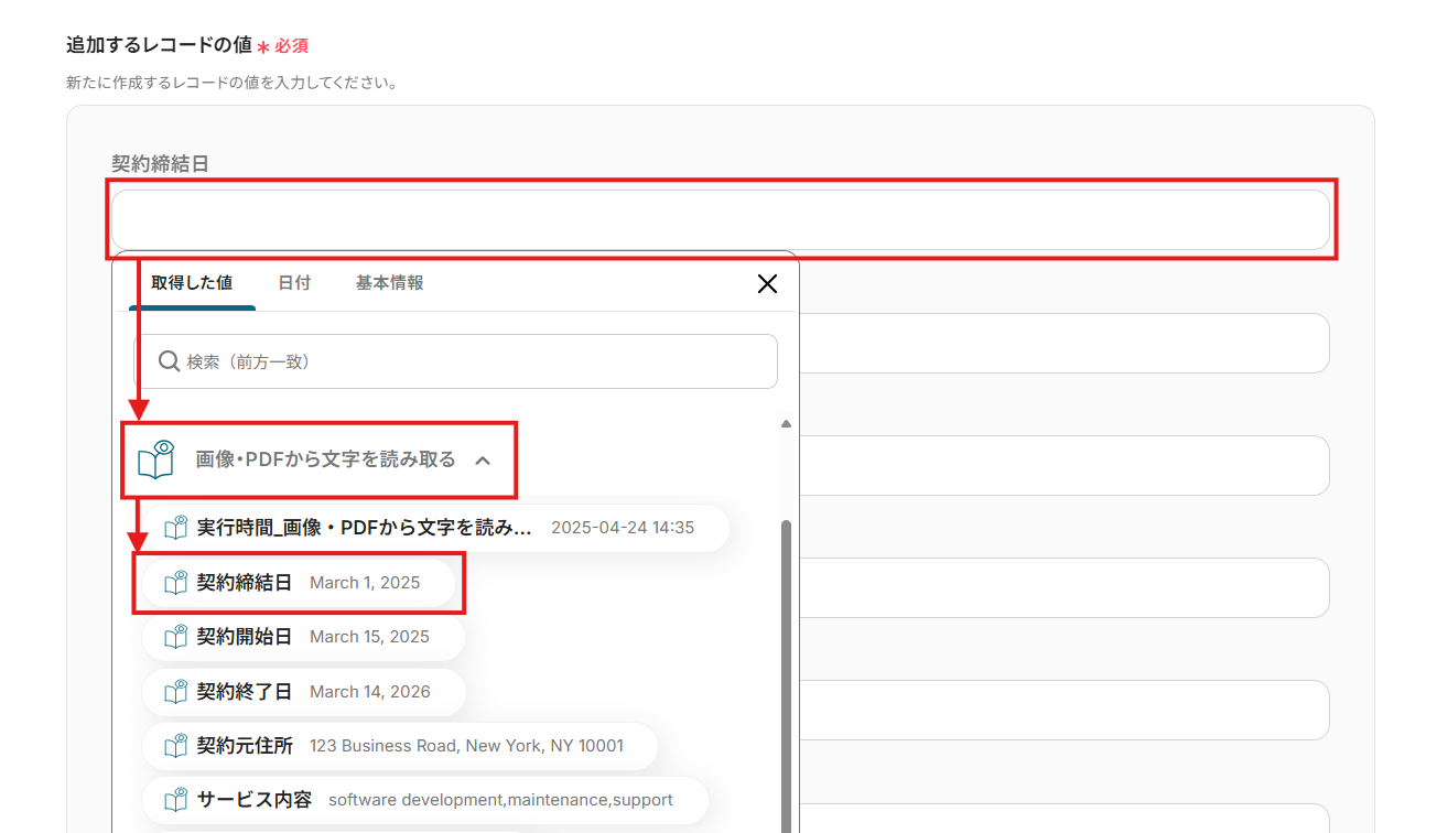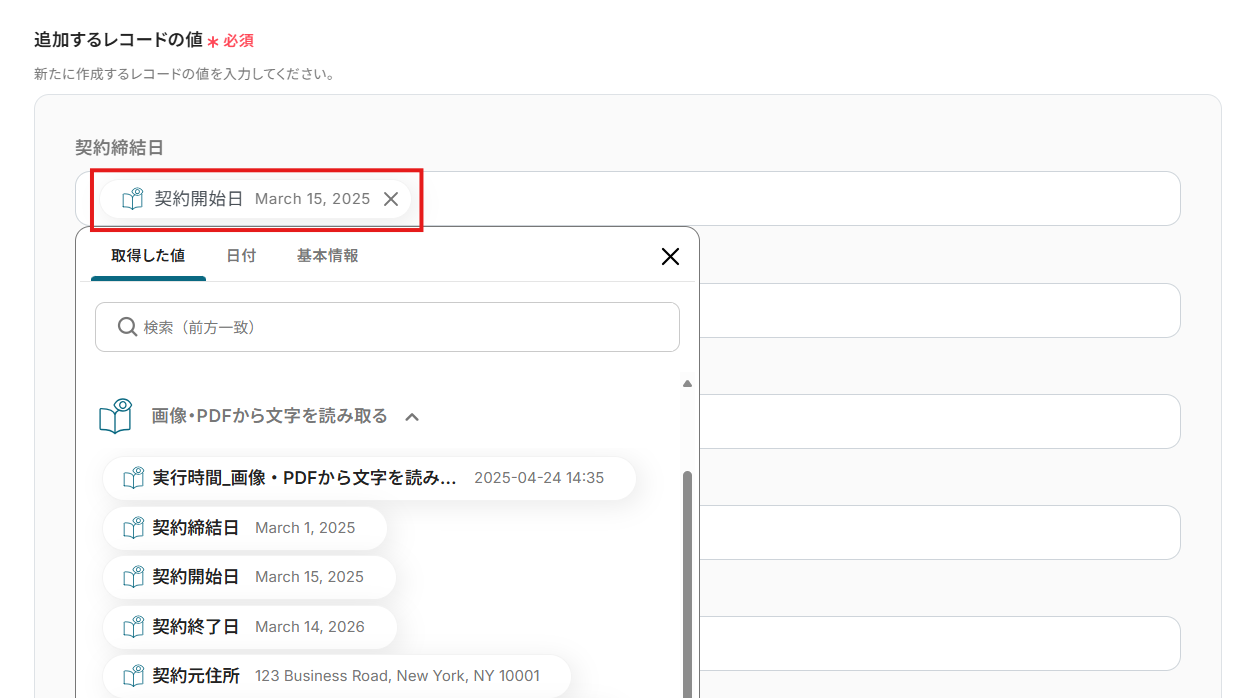 追加するレコードを設定していきます。 ※ 追加するレコードの項目は指定したテーブルの列名となっています。 入力欄をクリック後、「画像・PDFから文字を読み取る」のメニューを開くと、ステップ5で抽出した項目が表示されますので、各列に合う情報を選択してください。 選択すると{{項目名 抽出された情報}}のような形で入力されます。