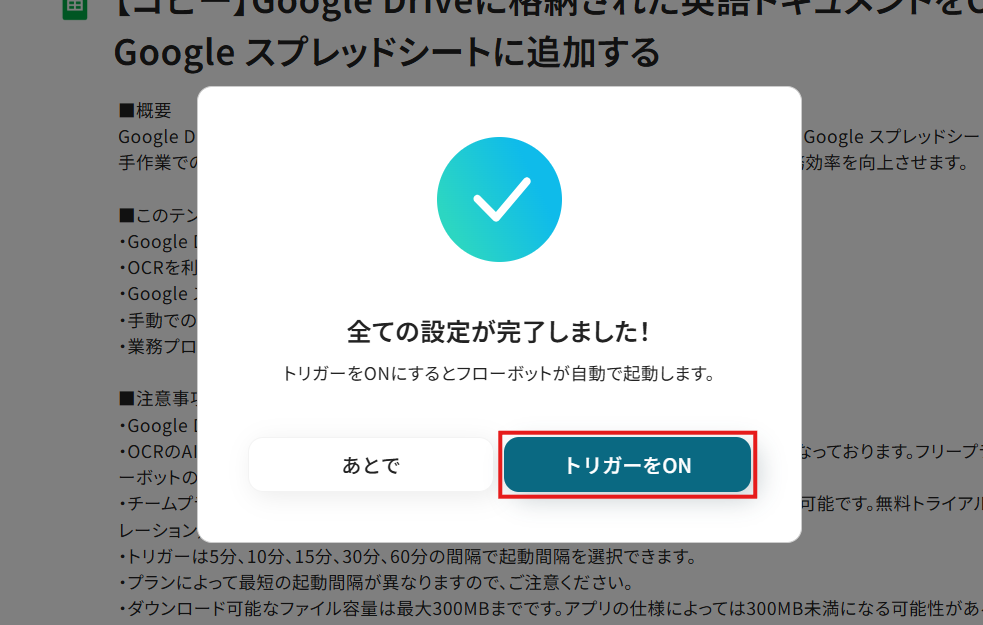 フロー画面に戻り、「全ての設定が完了しました!」と表示されていればフローの設定は完了です。 早速フローを稼働させるのであれば、「トリガーをON」をクリックします。