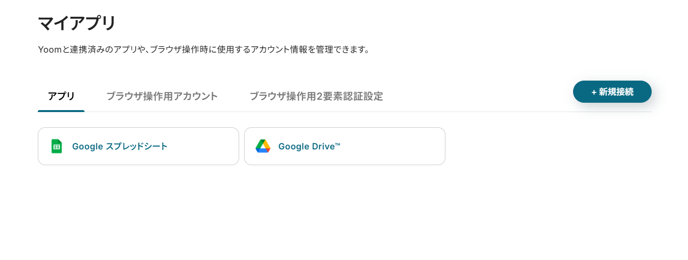 先ずは、Google DriveとGoogle スプレッドシートのアカウントを「マイアプリ」に登録しましょう。 この設定は初回のみ必要です。
