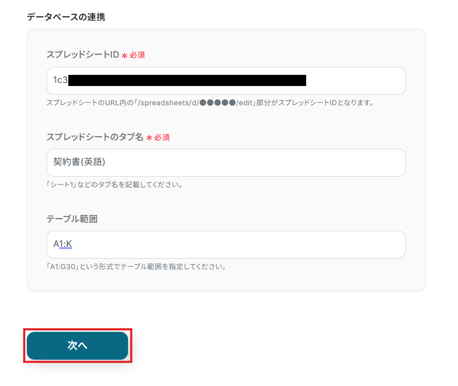 例として、「契約書管理シート」の場合はA1からK1までがテーブルの列になっているため、「A1:K」と入力します。