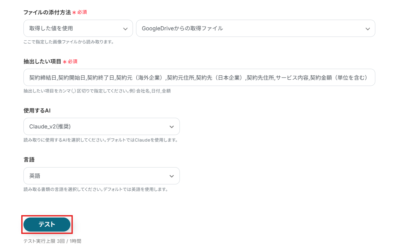OCRの詳しい設定方法は、こちらのヘルプページ をご覧ください。 設定を終えたら、「テスト」をクリック。 ここでは例として、デフォルトで設定されている項目を、ダウンロードしたファイルから抽出します。