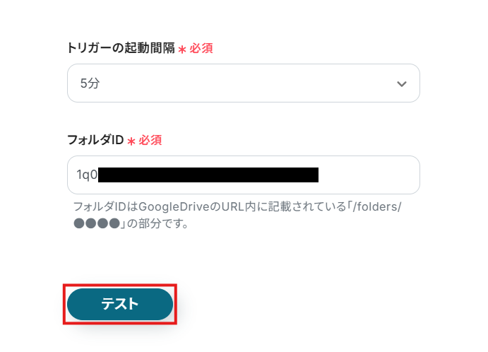 「フォルダID」にトリガーとなるフォルダのドライブのIDを設定。 入力欄をクリックすると、連携しているGoogle Driveアカウントからフォルダの候補が表示されますので、対象となるフォルダを選択してください。 検索欄にフォルダ名を入れると検索が楽になります。 ここでは例として、「連携用フォルダ」を設定しています。