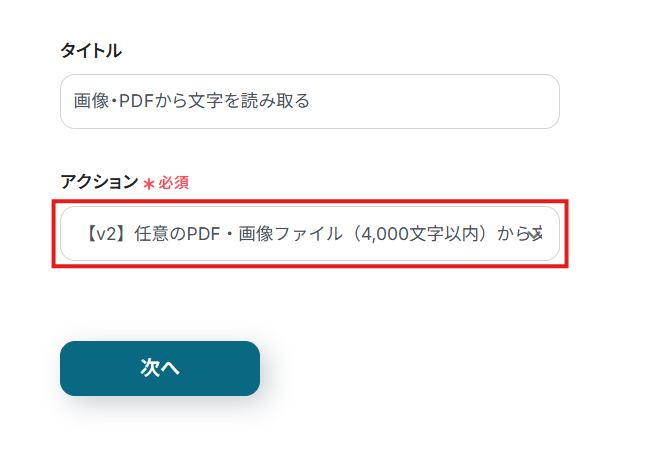 目的に応じて「アクション」を選択。 このフローで使用する「任意のPDF・画像ファイルから文字情報を読み取る」は文字数によってタスク数が変わります。 4,000字(5タスク)・8,000字(10タスク)・12,000字(15タスク)から任意のアクションを選択してください。デフォルトでは4,000字となっています。 ※ YoomのOCR機能では、アクション記載の規定の文字数を超えるデータや、文字が小さすぎる場合に正しく読み取れないことがあります。 文字数や文字の大きさには少し余裕を持たせてご利用ください。
