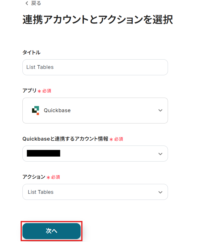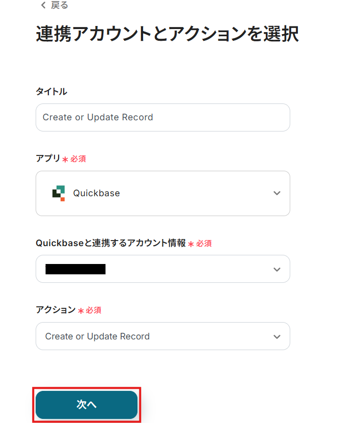 連携するアカウント情報には、ステップ1で連携したアカウント情報が反映されています。トリガーアクションはそのままにして、「次へ」をクリックしてください。