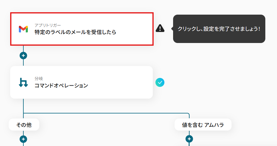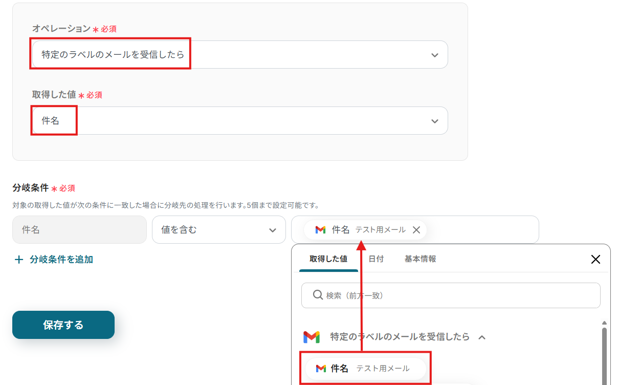オペレーションに「特定のラベルのメールを受信したら」、取得した値に検知したい項目を設定。