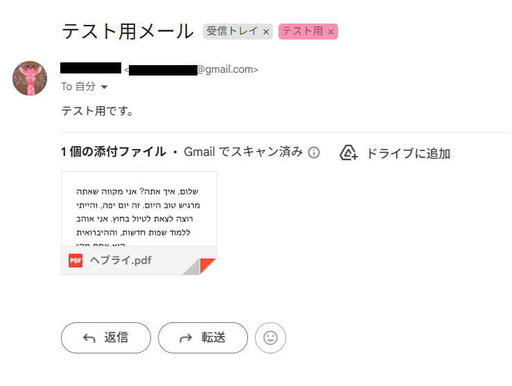 フローの作成を始める前に、あらかじめYoomと連携するGmailに、ヘブライ語のファイルを送信しておきましょう!