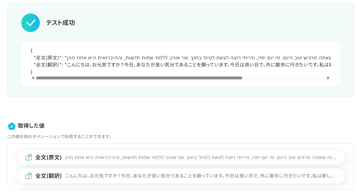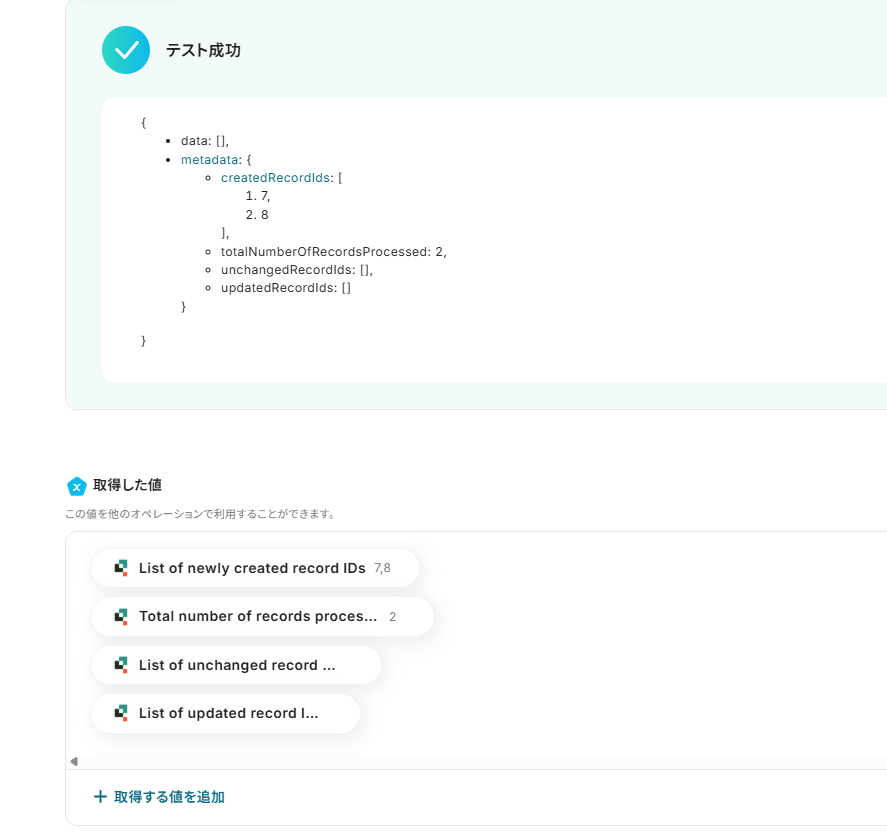 5.入力を終えたら「テスト」をクリックし、「取得した値」にデータが抽出されていることを確認してください。
