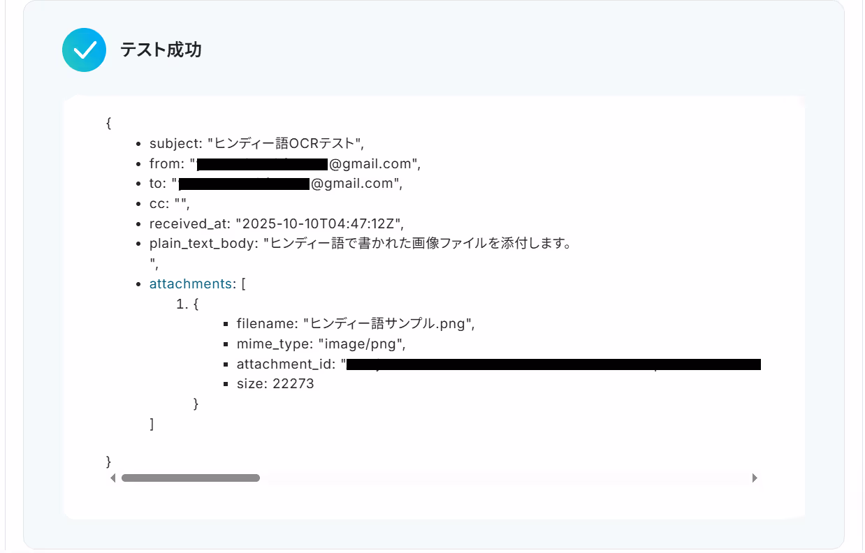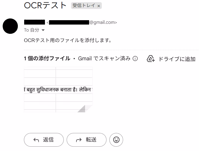 最後に、連携したGmailアドレスにヒンディー語のファイル付きメールを送信します。
