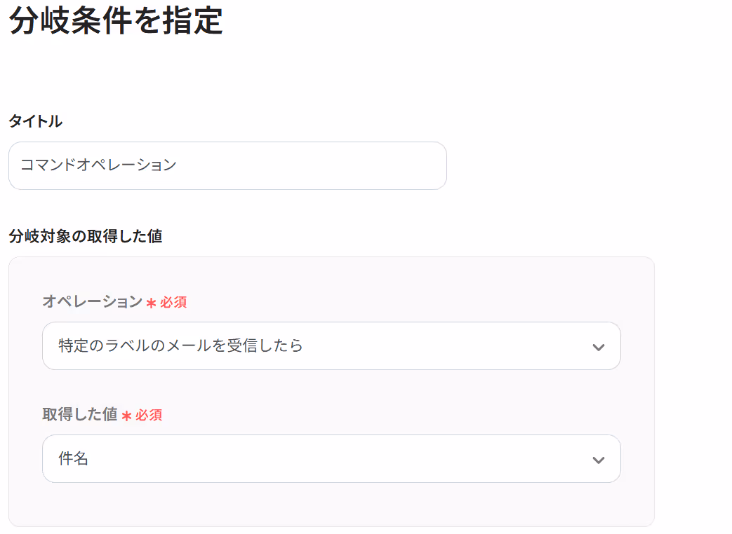 オペレーションは「特定のラベルのメールを受信したら」、取得した値は「件名」のままで大丈夫です。
