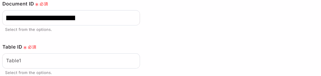 同様に、先ほど用意したテーブルのDocument IDとTable IDも候補から選択してください。