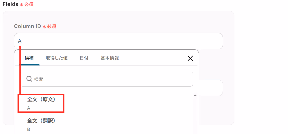 今回、抽出したい項目は原文と翻訳の「全文」としました。