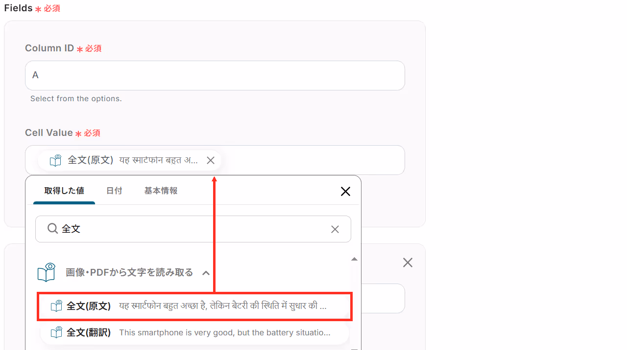Cell Valueには、Column IDの項目に合わせたOCRの値を設定してください。